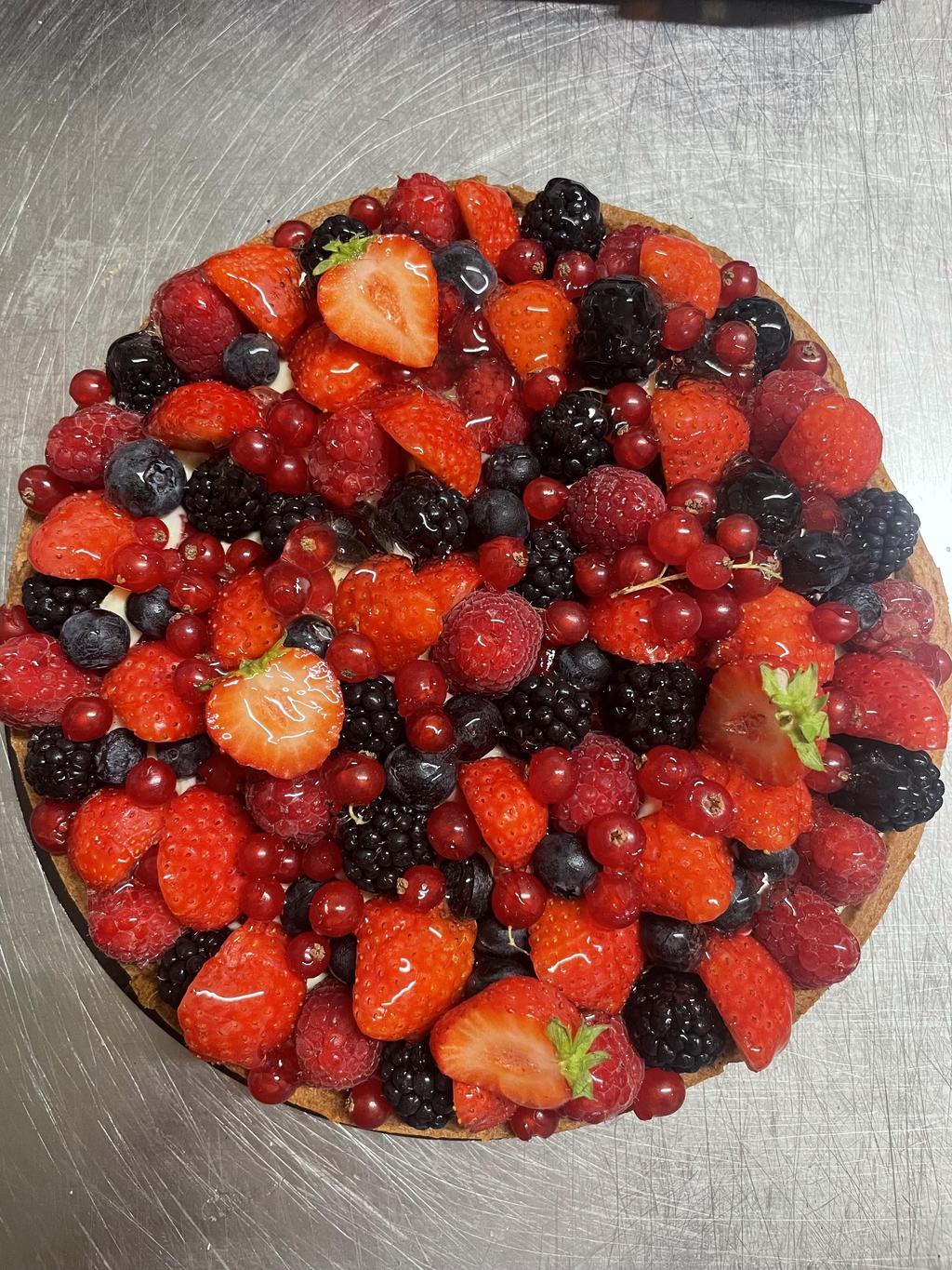 Pavlova aux fruits de saison, entremets impérial (royal chocolat) , tarte au citron meringuée, tiramisu, tarte aux fruits de saison, millefeuille, entremets rubis (passion framboise), cookie géant…